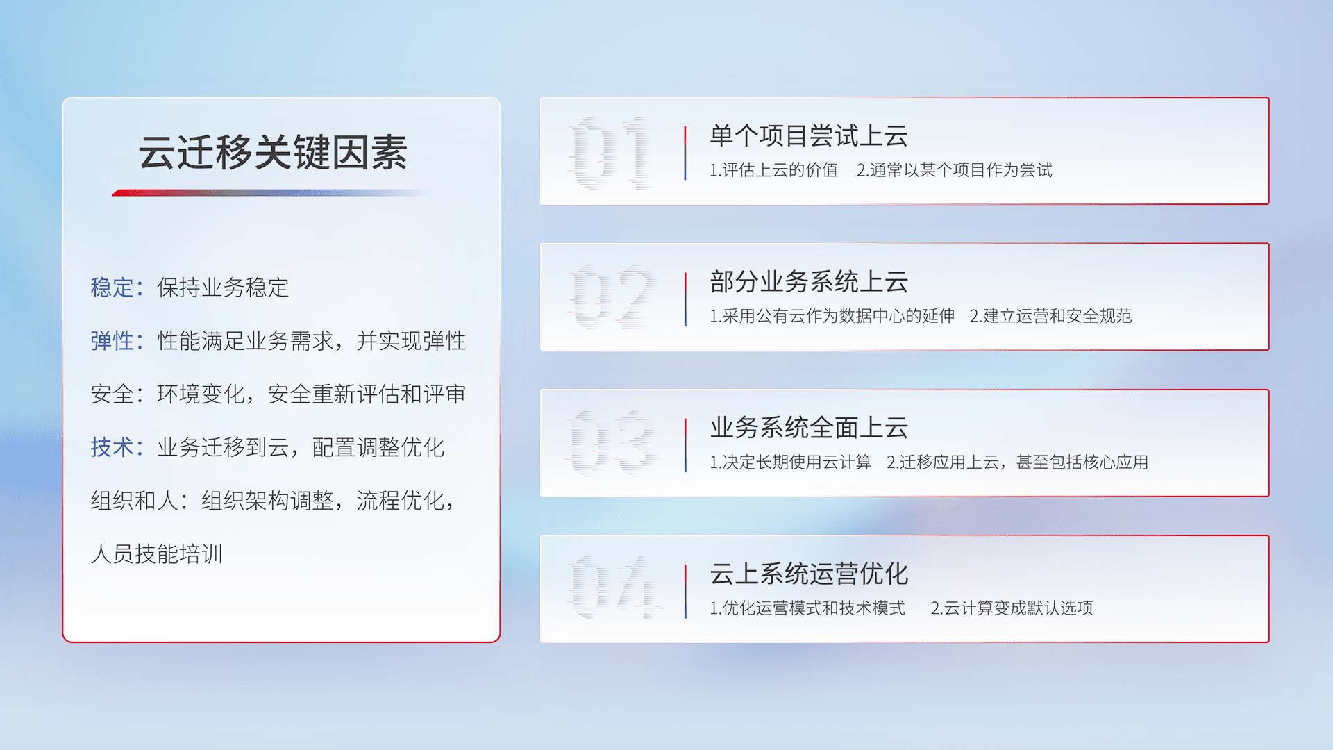 结合实际业务,,从规划设计、、云平台选型、、云原生改造、、、数据迁移、、集成交付,,,迁移全过程为客户识别最佳上云路径,,做好风险识别管理,,,设计网络架构、、身份权限、、、、安全审计合规、、操作审计、、、日志审计、、、监控告警策略、、多站点容灾设计等,,,,对云上基础设施进行整体规划,,提升IT治理水平,,,以满足弹性、、高可用、、、、高性能的需求。。