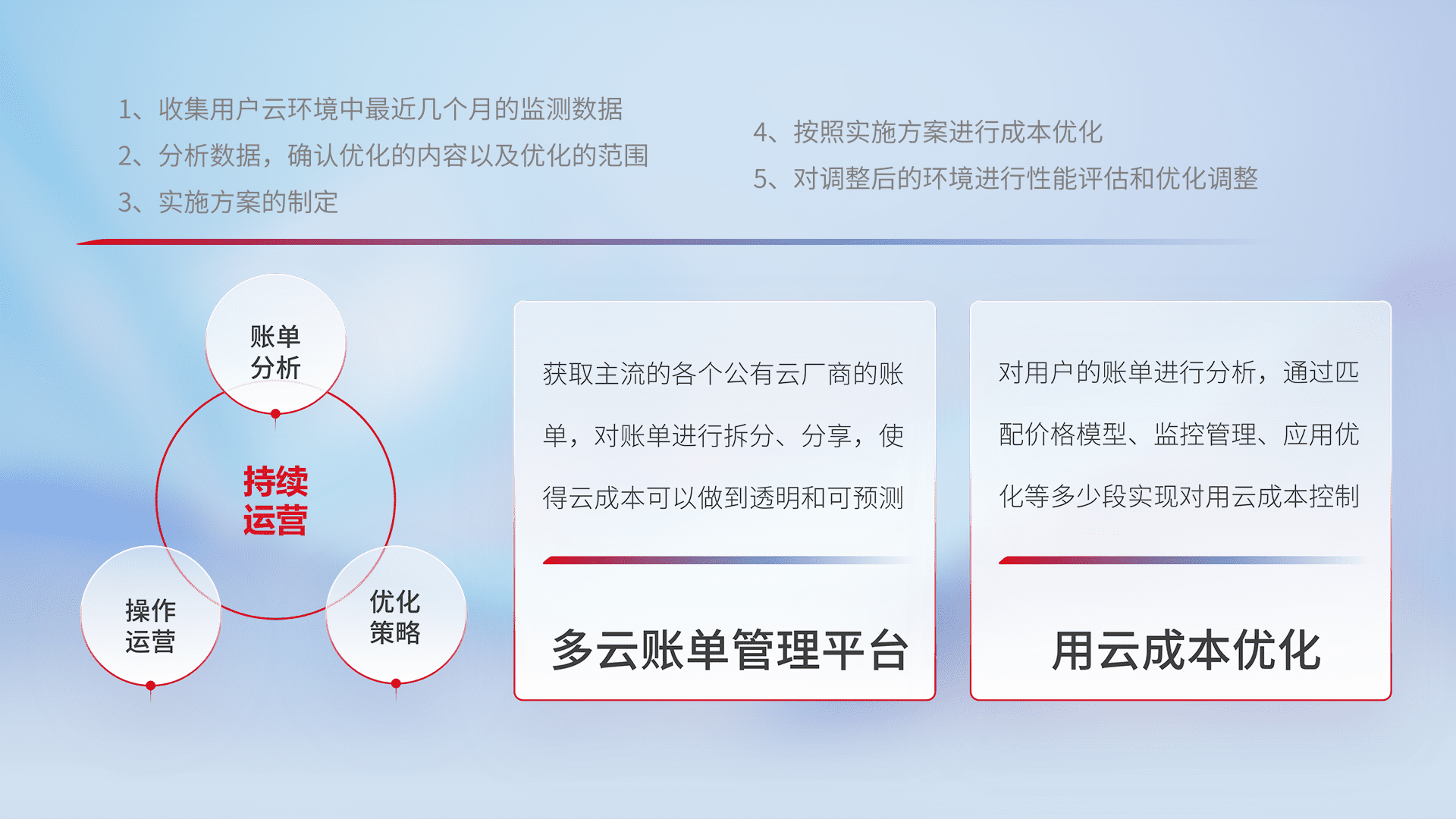 通过多云纳管,,以统一的资源数据模型把客户的云资源进行抽象和封装,,,,进而实现对多云资源的统一操作,,保障云资源管理的可靠性、、、稳定性与可用性。。。。量身定制化运维内容,,,配置、、、、开发运维、、补丁管理、、备份、、监控、、、、认证和访问管理、、审计和日常巡检等,,,保障在用云过程中的可靠度,,,,稳定度以及高可用率。。。