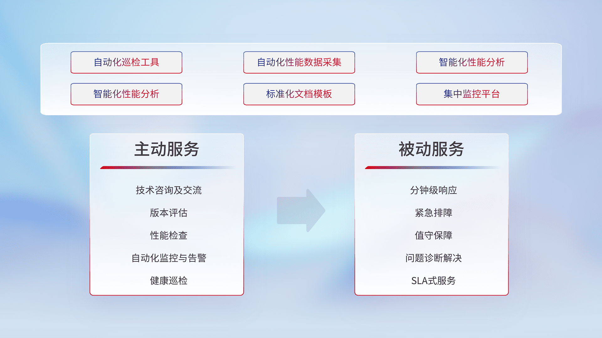 智能化工具和标准化文档,,,保障服务质量,,,提供主动服务(包含技术咨询、、、版本评估、、性能检查、、、自动化监控与告警、、、健康巡检)和被动服务包含(分钟级响应、、、紧急排障、、、值守保障、、问题诊断解决、、、SLA服务)。。。